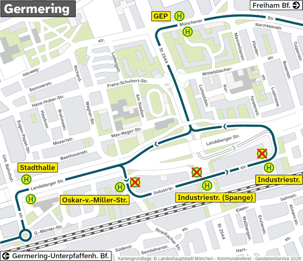 Wegen Kabelarbeiten in der Industriestraße wird die Buslinie 157 in Fahrtrichtung "Germering, Neue Gautinger Straße" zwischen "Germering, GEP" und "Germering, Stadthalle "umgeleitet. Die Haltestellen Industriestraße, Industriestraße (Spange) und Oskar-von-Miller-Straße entfallen.