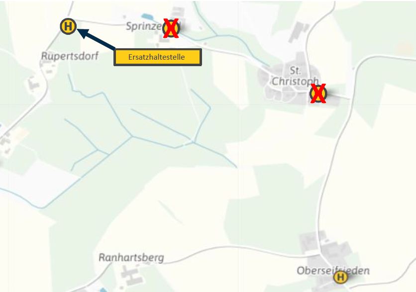 Aufgrund einer Baumaßnahme können die Bedarfshaltestellen "St. Christoph" und "Sprinzenöd" nicht bedient weren und entfallen im o.g. Zeitraum.