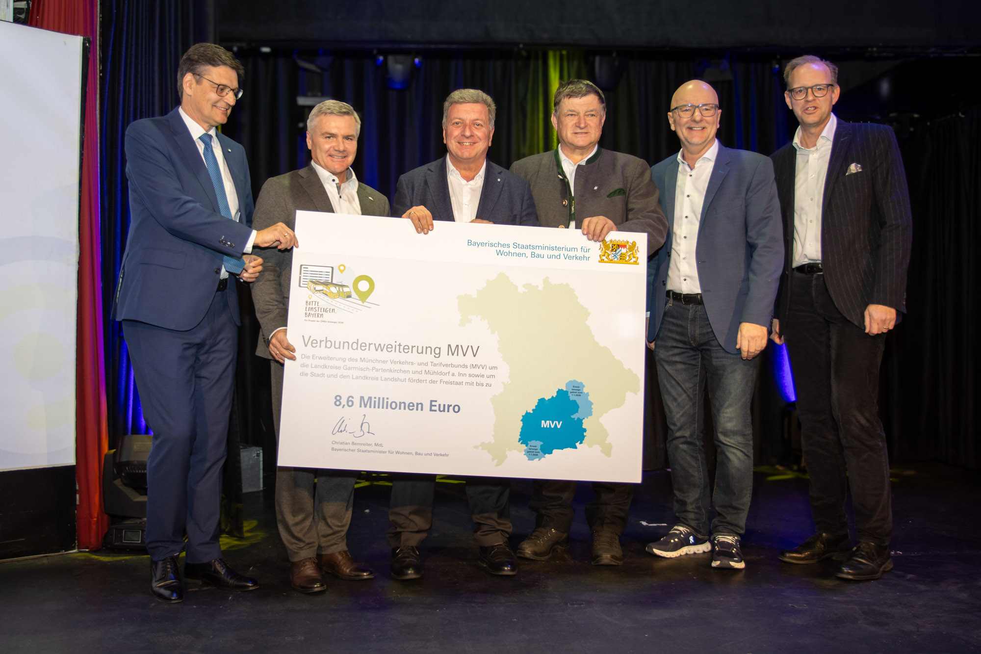Auf dem Foto von links: Anton Speer, Landrat des Landkreises Garmisch-Partenkirchen, Andrea Jochner-Weiß, Landrätin des Landkreises Weilheim-Schongau, Verkehrsminister Christian Bernreiter, Ministerpräsident Dr. Markus Söder, Landtagspräsidentin Ilse Aigner, Josef Niedermaier, Landrat des Landkreises Bad Tölz-Wolfratshausen, Olaf von Löwis, Landrat des Landkreises Miesbach, Otto Lederer, Landrat des Landkreises Rosenheim, Andreas März, Oberbürgermeister der Stadt Rosenheim und Bernd Rosenbusch, Geschäftsführer des MVV. Bildnachweis: Landratsamt Bad Tölz-Wolfratshausen (jpg, 1,47 MB)