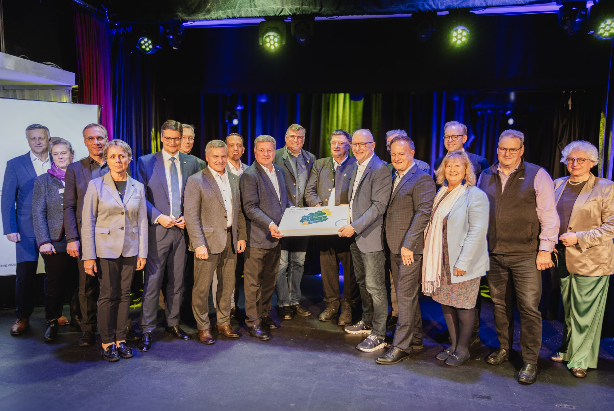 Landrat Max Heimerl (links) und MVV-Geschäftsführer Dr. Bernd Rosenbusch präsentieren die Übersichtskarte des neuen MVV-Verbundraum ab 1.1.2026 – mit dem Landkreis Mühldorf a. Inn. (jpg, 0,95 MB)